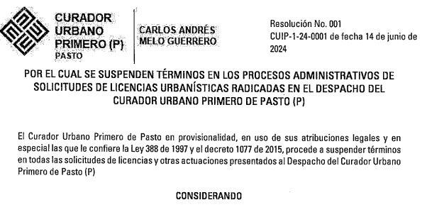 Suspensión de términos a los proyectos en curso radicados en la Curaduría Uno de Pasto